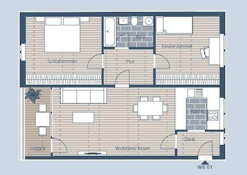 Die Wohneinheit selbst verfügt über einen großzügige Wohnküche mit Zugang zur Loggia. Über einen kleinen Zwischenflur ist das Bad sowie die zwei Schlafräume zu erreichen. Zugehörig ist ebenfalls ein eigener Kellerraum, im Untergeschoss des Gebäudes.
