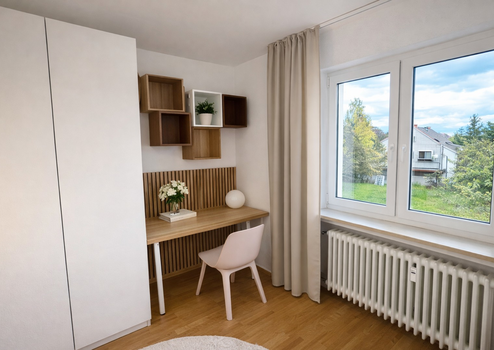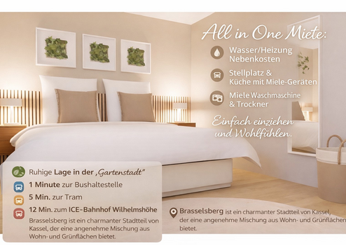 Diese frisch renovierte (neue Fenster, neue Böden) und hochwertig komplett möblierte 2.5-Zimmer-Wohnung (71 m²) liegt im 1. OG eines sehr gepflegten Mehrfamilienhauses mit wenigen Parteien am Kasseler Brasselsberg. Sie ist ein Erstbezug nach Komplettausstattung und verbindet ruhiges Wohnen im Grünen mit perfekter Anbindung an die Innenstadt und den ICE-Bahnhof Wilhelmshöhe. Ein kleiner Arbeitsplatz/Homeoffice-Bereich ist mitgedacht, sodass Wohnen und Arbeiten leicht zusammenpassen.