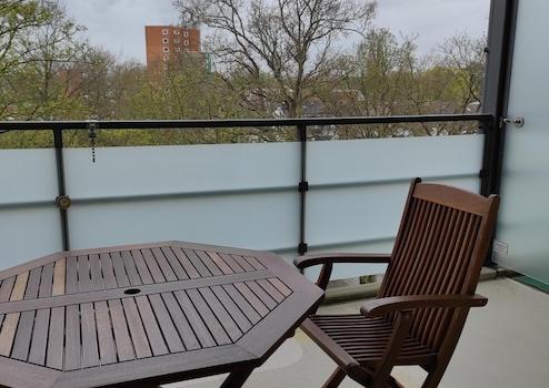 Die Wohnung hat zwei Zimmer, ein Bad mit Badewanne und eine große Terrasse.