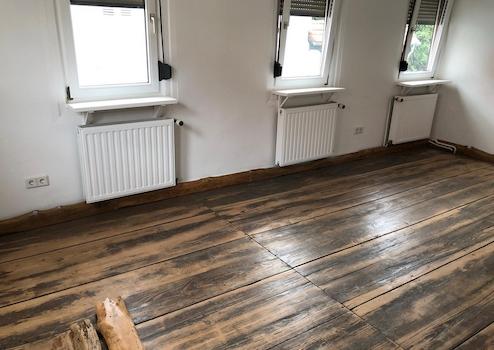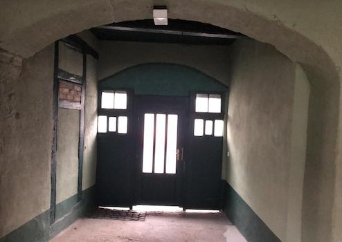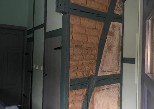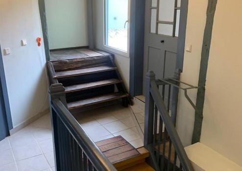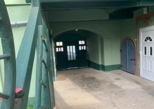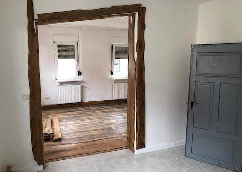 Die ganze Wohnung ist lichtdurchflutet, sehr seltener Holzdielenboden, Fachwerk und Kacheln verbinden alte Bausubstanz mit der Moderne. Die Wohnung verfügt über zwei Zugänge im ersten Stock und über einen kleineren Zugang auf das Anwesen im EG mit einem Torhaus und einem Eingang über eine Tür in einem großen Rundtor.
