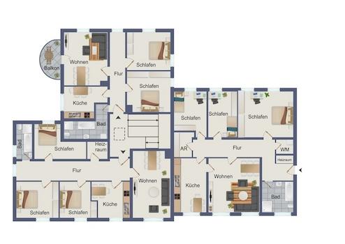Das Obergeschoss umfasst insgesamt ca. 308 m² Wohnfläche, aufgeteilt auf drei Wohneinheiten. Die Etage wurde im Jahr 2016 zu eigenständigen Wohneinheiten umgebaut bzw. unterteilt. Jede Einheit verfügt über eine separate Etagenheizung, die in den Jahren 2014 bzw. 2016 erneuert wurde. Die Wohnungen befinden sich in einem einfachen, teils renovierungsbedürftigem Zustand und bieten weiteres Entwicklungspotenzial - sowohl im Hinblick auf Modernisierung als auch auf mögliche Mietanpassungen.