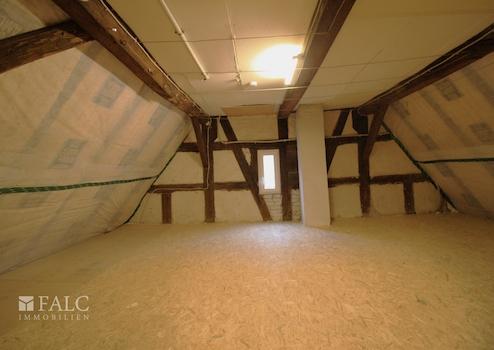 Ein besonderes Highlight ist der ausgebaute Spitzboden: Über eine Treppe erreichbar, erwartet Sie hier ein weiteres Zimmer mit sichtbaren Holzbalken, das sich ideal als Schlaf-, Arbeits- oder Gästezimmer eignet. Zusätzlich steht im Dachgeschoss ein separater Abstellraum mit großzügiger Fläche zur Verfügung.