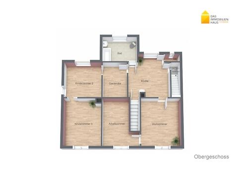 Küche, Abstellkammer, Wohnzimmer, Arbeitszimmer, Bad, Garderobe, zwei Kinderzimmer