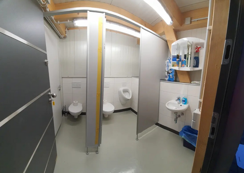Toilettenzugang mit Waschbecken und separatem Technikraum