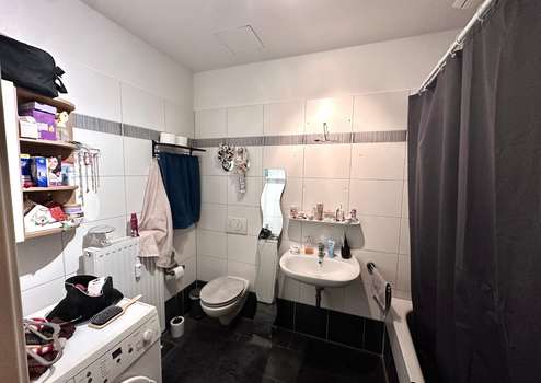 Das modern ausgestattete Badezimmer ist mit einer Badewanne versehen und lädt zum Entspannen ein. Ein praktischer Abstellraum mit Waschmaschinenanschluss sorgt zusätzlich für Komfort und Ordnung.
