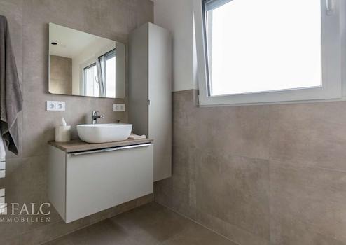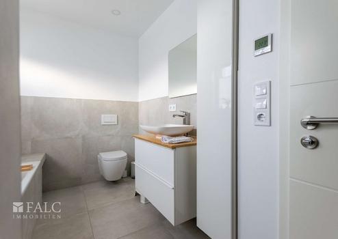 Auch das 2. Obergeschoss verfügt über Laminatboden. Hier befinden sich ein großzügiges Schlafzimmer mit direktem Zugang zum großen Balkon sowie ein weiteres Tageslichtbad mit Walk-In-Dusche, Waschbecken mit Unterschrank, WC und Handtuchwärmer. Ein zusätzlicher Hochschrank bietet Platz für Handtücher und Badeutensilien.