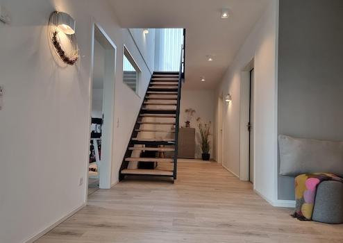 Im Untergeschoss eröffnet sich das Haus durch den Eingangsbereich mit großzügigem Garderobenraum und einer geradlinigen, modernen Treppe in das EG mit Treppenstufen aus lasierter Eiche.