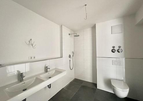 Das Badezimmer ist ein echtes Highlight: Es erwartet Sie eine Badewanne, zwei Waschbecken und eine begehbare Dusche. Die Wandfliesen in edlem Weiß und die Bodenfliesen in zeitlosem Grau verleihen dem Raum eine hochwertige und stilvolle Note. Der gesamte Bereich schafft eine luxuriöse und gleichzeitig entspannte Atmosphäre – ein Ort, an dem Sie gerne Zeit verbringen.