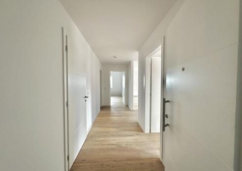 Zusätzlich führt auch das Büro, Kinderzimmer oder Gästezimmer mit bodentiefen Fenstern auf die Loggia, was für eine noch intensivere Verbindung von Innen- und Außenbereich sorgt. Die Wohnung besticht durch ihre klare, moderne Gestaltung und die viel Licht durchfluteten Räume.