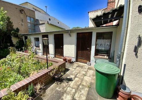Zum Verkauf steht ein charmantes Reihenendhaus / Zweifamilienhaus im Stadtkern von Schmölln, direkt in der Nähe des Bahnhofs und Busbahnhofs. Das Haus befindet sich auf einem 190 m² großen Grundstück und bietet mit seinem kleinen, aber gemütlichen Innenhof einen schönen Rückzugsort. Der Innenhof umfasst eine Grünfläche sowie ein Nebengebäude mit praktischen Nebenräumen, die zusätzlichen Stauraum und Möglichkeiten zur Nutzung bieten. Hier befinden sich ein Heizungsraum mit Dusche und Waschbecken, ein Schuppen, eine Abstellkammer und eine Werkstatt – ideal für Hobbyhandwerker oder als Lagermöglichkeit.