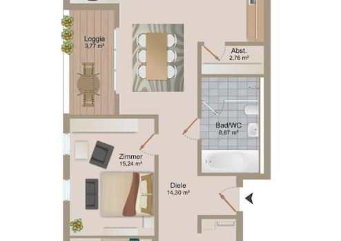 Diese elegante Dachgeschosswohnung überzeugt durch ihren offenen Wohn- und Essbereich, der mit viel Licht durchflutet wird und direkten Zugang zur Loggia bietet. Der angrenzende Abstellraum und die Garderobe bieten praktischen Stauraum, und von der Garderobe aus gelangen Sie in das Gäste-WC, das ebenfalls geschmackvoll und funktional gestaltet ist.