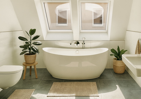 Das Badezimmer dieser Wohnung ist das wahre Highlight. Die freistehende Badewanne steht zentral im Raum und zieht sofort die Blicke auf sich. Zwei großzügige Dachfenster über der Badewanne erlauben einen atemberaubenden Blick in den Sternenhimmel und sorgen für ein besonders luxuriöses Badeerlebnis. Die Wandfliesen in edlem Weiß und die Bodenfliesen in modernem Grauton verleihen dem Raum eine exklusive Atmosphäre. Abgerundet wird das Badezimmer mit einer bodentiefen Dusche und zwei Waschbecken, die für höchsten Komfort sorgen.