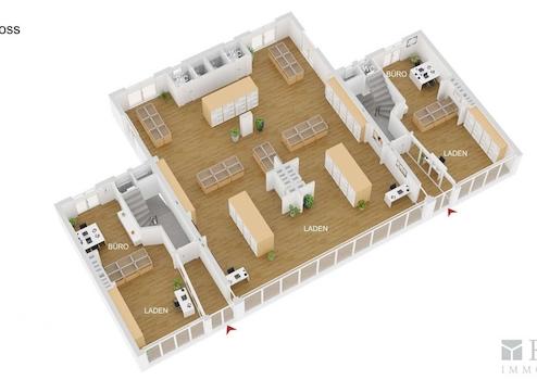 Das Erdgeschoss bietet vielseitige Nutzungsmöglichkeiten auf einer Fläche von 1022,12 m², ideal für Gewerbetreibende, die von der lichtdurchfluteten Atmosphäre profitieren möchten. Die oberen Etagen beherbergen flexible Büro- und Wohneinheiten, die durch ihre funktionale Aufteilung und helle Räume bestechen.