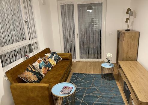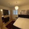 Sie verfügt über ein getrenntes Schlafzimmer mit großem Schrank, ein elegantes Duschbad mit Waschmaschine und Trockner, einen Küchenbereich sowie ein komfortabel ausgestattetes Wohn- und Esszimmer mit Schlafsofa und Smart-TV.