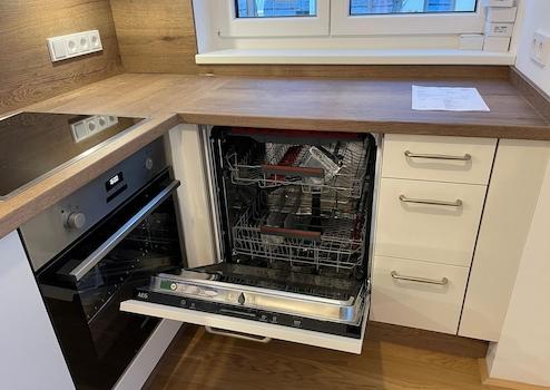 Eichenparkett / Fliesen (im Bad) mit Fußbodenheizung, Marken-Einbauküche mit Markengeräten (Induktionsherd, Spülmaschine, Backrohr, Kühl-/Gefrierschrank), vollständige und hochwertige Möblierung in allen Räumen, Lampen und Vorhänge, große Terrasse, Garten-Exklusivnutzung, Tiefgaragenstellplatz, Abstellraum, Besucher-Stellplätze vor dem Gebäudekomplex und in der Tiefgarage, elektrische Rolläden, automatische Belüftungsanlage.
