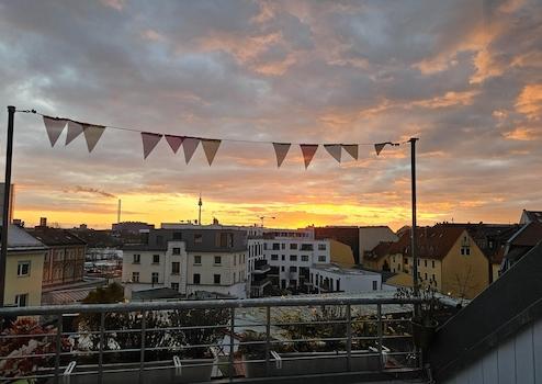 Im Großteil der Wohnung erstreckt sich die Raumhöhe bis in den Dachgiebel, was den besonderen Flair unterstreicht. In zwei Bereichen ist ein Zwischenboden eingezogen, der neben den zwei Abstellkammern zusätzlichen Stauraum bietet. Das Highlight ist die sonnige, nach Süd-Westen ausgerichtete, nahezu uneinsehbare Dachterrasse mit toller Aussicht auf den Fernsehturm und spektakuläre Sonnenuntergänge. Durch die Fenster nach Norden erblickt man u.a. die historischen Dächer von Opernhaus, Spittlertorturm und Weißem Turm.