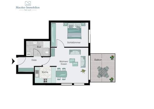 Die Wohnung befindet sich im 1.Obergeschoss eines Mehrfamilienhauses. Wohn-/Esszimmer mit Küche, Balkon, Abstellraum, Schlafzimmer, Flur, Bad mit Dusche, WC und Waschmaschinenanschluss. Zur Wohnung gehört ein eigener Kellerraum. Ein Waschkeller und Fahrradkeller stehen der Hausgemeinschaft zur Verfügung.