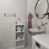 Innenliegendes Bad mit Badewanne, Waschbecken und Waschmaschinenanschluss