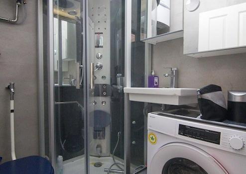 Badezimmer hat Dampfsauna/Dusche, WCs und gut platzierte kleine Waschmaschine. Hier ist der kleiner Raum ist wirklich optimal eingerichtet.
