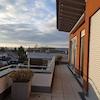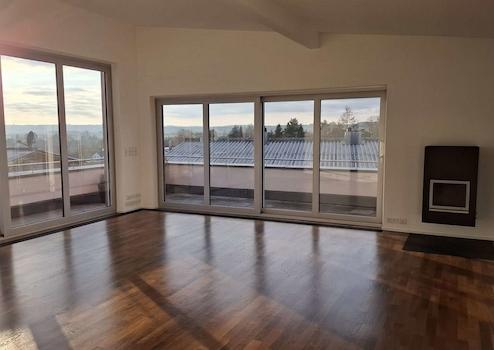 Die Dachterrasse ist großzügig. Sie läuft Entlang der Südseite von Osten her und geht auf die Westseite über. Die Terrassenfläche beträgt ca. 60m². In der Wohnfläche ist diese nur anteilig enthalten.