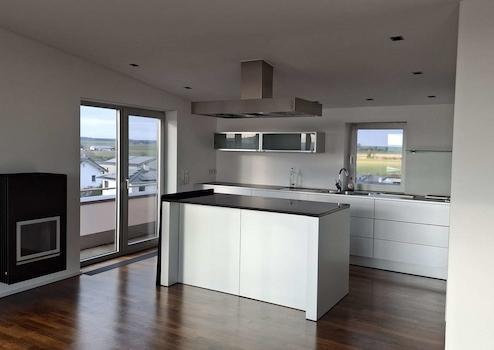 Der Wohn- Essbereich ist lichtdurchflutet und Richtung Süden kann man den wunderschönen Fernblick und Blick über Langenau geniesen. In den Wintermonaten kann man den exklusiven Kaminofen nutzen.