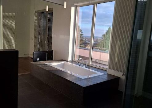 Es gibt ein großzügiges, exklusiv ausgestattes Badezimmer und eine separate Gästetoilette mit Dusche.