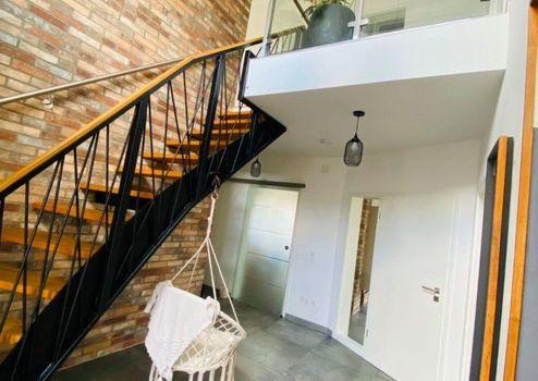 Der Eingangsbereich begrüßt Sie mit einer eleganten Galerie, die das Haus mit einem einladenden Ambiente empfängt. Die Flurwand ist mit stilvollen Klinkerriemchen versehen, die dem Flur eine Vintage-Note verleihen.