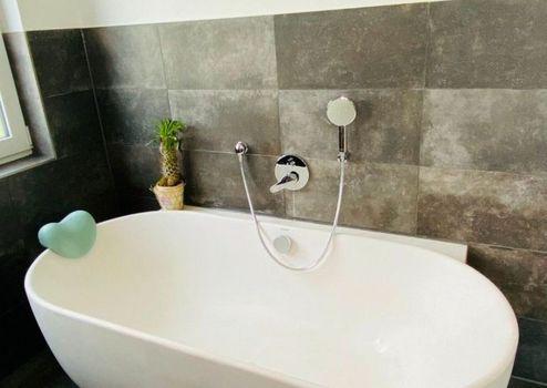 Im OG befinden sich die gemütlichen Schlafzimmer und das Badezimmer, das mit einer stilvollen Ausstattung und einer großzügigen Dusche und hochwertiger ovaler Badewanne ausgestattet ist.