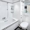 Die gepflegte Einbauküche in Buche bietet Platz für einen kleinen Essbereich. Das Vollbad ist zeitlos gestaltet, mit hellen Fliesen, schwarzem Granitboden, Badewanne und Handtuchheizkörper.