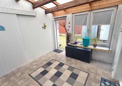 Erdgeschoss: Wohnzimmer, Esszimmer (mit Zugang zur überdachten Terrasse), Küche, Diele (mit Garderobe und Kellerabgang), Abstellraum
