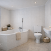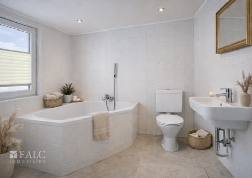 - Hauptbadezimmer im Obergeschoss mit Fenster und großer Eckbadewanne