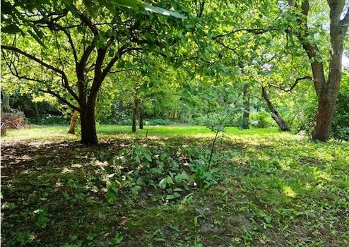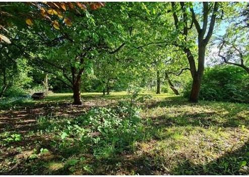 Bisher war das Gelände noch nie bebaut und wurde ausschließlich als Garten und Erholungsfläche genutzt. Es hat einen Baumbestand u.a. mit verschiedenen Obstbäumen und Sträuchern, die eine grüne Oase um eine einzigartige Eiche im hinteren, südlichen Teil der Fläche schaffen. Durch das ca. 60m lange unverbaubare Grundstück ergeben sich so viele Möglichkeiten der freien Gestaltung. Der Bereich des Bauplatzes ist baumfrei.