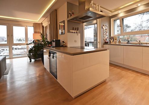 Der Schnitt und die Ausstattung der Wohnung bieten eine wirklich besondere Lebensqualität. Ein Wohn- & Essbereich mit offener Küche und Kochinsel geht mit zwei Zugängen in eine große Loggia über, die mit verschiebbaren Glaselementen eine windgeschützte Privatsphäre ermöglicht. Die moderne, zeitlose Küche verfügt über eine technisch sehr gute Ausstattung: z.B. einen extra Weinkühlschrank und neben dem Backofen auch über einen Dampfgarer - beide Geräte liegen oberhalb Hüfthöhe und können parallel zum Einsatz kommen.