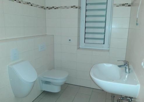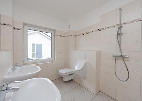In allen Bädern befinden sich bodengleiche Duschen – und zum Objekt jeweils auch ein Urinal für rasche Dinge. Das ist besonders nützlich, wenn zwei passende Personen zugleich Eile anmelden, etwa frühmorgens oder nach einer Fernsehsendung oder nach einer Rückkehr von außerhalb. Auch darin zeigt sich die besondere Exklusivität des Hauses, die es sonst nirgends gibt. Im OG enthalten beide Bäder doppelte Waschtische und je einen Handtuchwärmer. Die Badewanne im en-suite ans Elternschlafzimmer angeschlossene Masterbad mißt 180 x 80 cm.