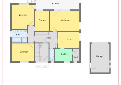 Eingangsbereich, Gäste-WC, Küche mit Speisekammer und Esszimmer mit Morgensonne, Elternschlafzimmer, Bad und Kinderzimmer mit Abendsonne, Wohnzimmer mit Balkon- und Gartenzugang mit Fenstern und Türen nach Norden und Westen