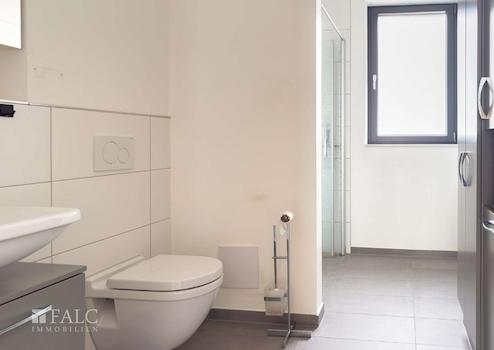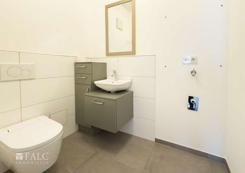 Das Tageslicht-Bad verfügt über eine begehbare Dusche mit Glastür, ein maßgefertigter Spiegelschrank über dem Waschbecken, ein WC sowie ein Handtuchwärmer sorgen für Komfort und Funktionalität. Das separate Gäste-WC ist mit einer elektrischen Dusch-WC-Funktion ausgestattet und bietet zudem Platz für Waschmaschine und Trockner. Beide Sanitärräume sind in einem eleganten Weiß-Grau gehalten, so dass Sie farbliche Akzente ganz nach Ihren Lieblingsfarben setzen können. Die jeweiligen Badmöbel sind bereits im Preis enthalten.