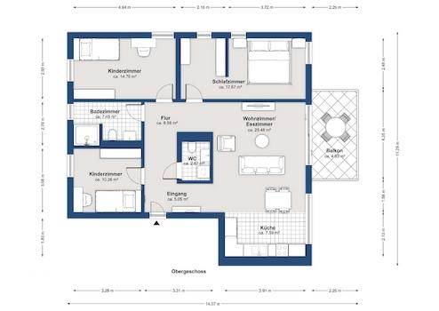 • zwei flexibel nutzbaren Kinder- oder Arbeitszimmern