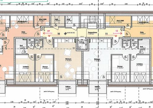 WE12: Dachgeschoss, 2 Zimmer, 69,69m² Wohnfläche, Balkon, Einbauküche. 941€ Nettokaltmiete zzgl. 209€ Nebenkosten, 40 EUR Autostellplatz, 60 EUR für die neue Einbauküche (insgesamt 1250EUR pro Monat).