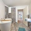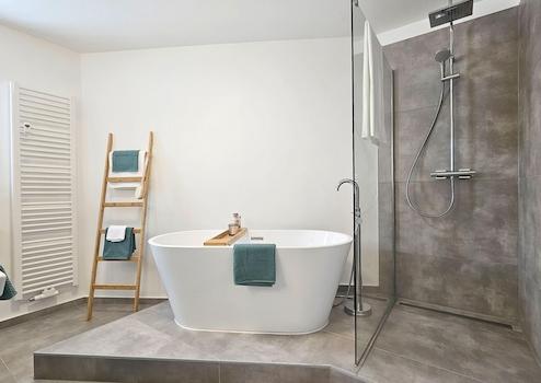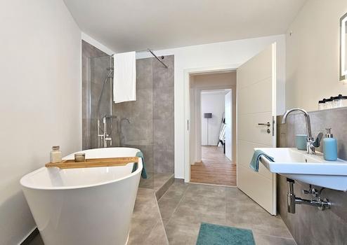 Das moderne Badezimmer ist hochwertig ausgestattet und vereint Komfort und Design: Eine begehbare Dusche sowie eine freistehende Badewanne laden zum Entspannen ein.