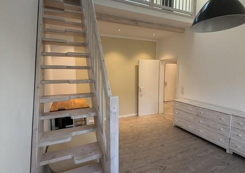 Die Wohnung präsentiert sich mit einem offenen, fast atelierartigen Charakter über zwei Ebenen. Großzügige Deckenhöhen von bis zu etwa 5,00 Metern verleihen den Räumen Weite und eine besondere architektonische Ausstrahlung. Auf der Empore entsteht zusätzlicher Freiraum – ideal als Schlafplatz, Homeoffice oder Rückzugsort – und zugleich eine natürliche Gliederung zwischen Wohn- und Privatbereich.