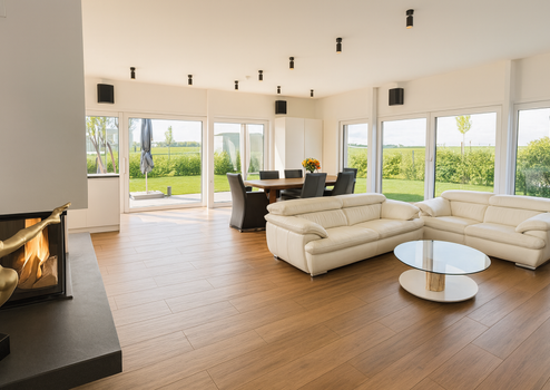 Schon beim Eintreten entsteht ein Gefühl von Weite und Ruhe. Großzügige Fensterfronten, hohe Decken und fließende Übergänge zwischen Innen- und Außenraum schaffen eine besondere Präsenz. Küche, Wohn- und Essbereich bilden eine offene Einheit, in der Kochen, Leben, Musik und Gespräche selbstverständlich zusammengehören. Der Kamin, die Lichtstimmungen und die durchdachte Akustik machen diesen Raum zu einem Ort, an dem man ankommt und bleibt.