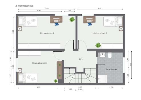 Im zweiten Obergeschoss stehen drei Kinderzimmer sowie ein weiteres Badezimmer zur Verfügung, wodurch sich diese Ebene besonders als Schlaf und Rückzugsbereich eignet. Die Zimmer lassen sich je nach Lebensphase als Kinderzimmer, Gästezimmer oder Hobbyräume nutzen und bieten damit eine flexible Grundlage für unterschiedliche Wohnkonzepte. Das Badezimmer ergänzt die Etage als eigenständige Einheit und unterstützt einen reibungslosen Ablauf im Alltag, wenn mehrere Personen gleichzeitig Platz benötigen. Insgesamt entsteht hier ein stimmiger Bereich, der Privatsphäre schafft und dennoch gut an das Treppenhaus angebunden bleibt.