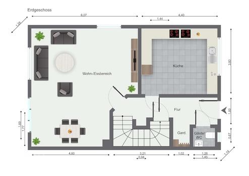 Im Erdgeschoss empfängt Sie ein Eingangsbereich, der in den Flur mit Garderobenbereich übergeht und die Wege im Haus angenehm bündelt. Von hier aus erreichen Sie das Gäste WC, das praktisch im Alltag und bei Besuch liegt. Ebenfalls auf dieser Ebene befinden sich die Küche sowie der Wohn und Essbereich, die zusammen den Mittelpunkt des täglichen Lebens bilden und kurze, funktionale Abläufe ermöglichen. Die Anordnung der Räume wirkt dabei alltagstauglich und lässt sich je nach Bedarf flexibel möblieren.