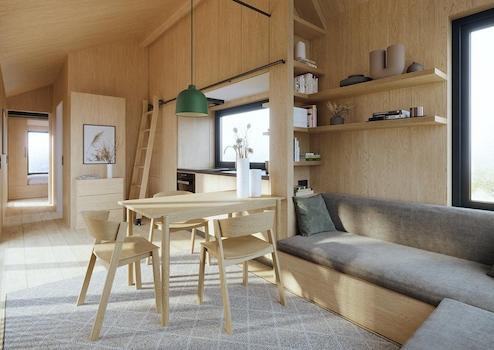 Jedes Tiny House verfügt über eine moderne großzügige Küche, einen offenen Wohnbereich mit direktem Zugang zur Terrasse und vielfältige Stauraumlösungen in Schränken und Regalen. Im Außenbereich erwartet Sie ein privater Garten und ein eigener PKW-Stellplatz. Der Wohnraum zeichnet sich durch seine hohen Wände und großen Fenster aus, welche in Kombination mit der Fußbodenheizung selbst im Winter für ein helles und angenehmes Raumklima sorgen.