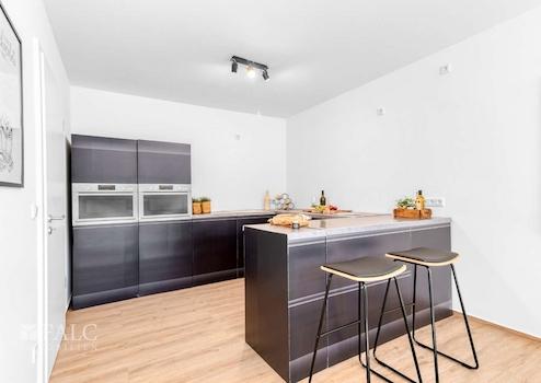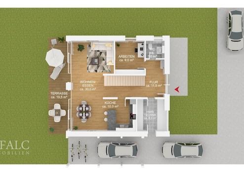 Das Flachdach ist begrünt und trägt ebenso wie die gesamte Haustechnik zur nachhaltigen Ausrichtung des Gebäudes bei. Ein angrenzender Stellplatz rundet das Angebot ab.