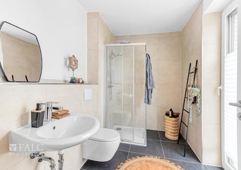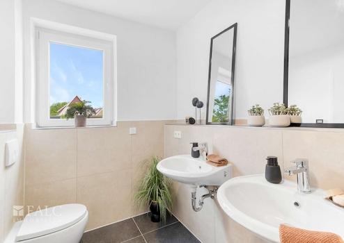 Im Obergeschoss erwarten Sie ein komfortables Elternschlafzimmer mit Bad en Suite, zwei helle Kinderzimmer mit einem Duschbad. Das weitere Duschbad sorgt für zusätzlichen Komfort im Familienalltag. Großformatige Fliesen, Rainshower-Duschen und Handtuchheizkörper unterstreichen den hohen Ausstattungsstandard.