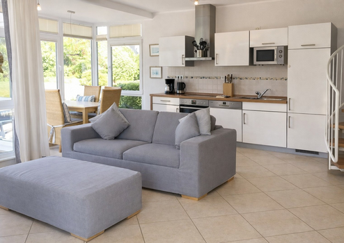 Das Haffnest zeichnet sich durch eine lichtdurchflutete und nach Süd-Westen ausgerichtete Fensterfront aus. Sie gelangen durch den kleinen Vorraum im Erdgeschoss in den gemütlichen Wohn- und Essbereich. Der Essbereich bietet durch den Wintergarten schon beim Frühstück einen wunderschönen Blick auf den Hafen von Rerik. Die an den Wohnbereich angrenzende große Terrasse mit wunderschönem großen Garten gewährt, trotz der zentralen Lage am Haff, ausreichend Privatsphäre und lässt Sie durch die Süd-West Lage den ganzen Tag die Sonne an der Ostsee genießen.