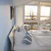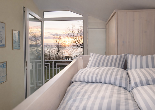 Durch eine Echtholz Wendeltreppe gelangen Sie in den ersten Stock, wo sich zwei Schlafzimmer und das Badezimmer mit Dusche und WC befinden. Beide Schlafzimmer verfügen über einen Balkon und einen tollen Blick auf das Haff, die Insel Wüstrow und den Hafen von Rerik.
