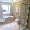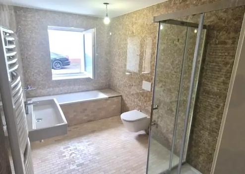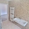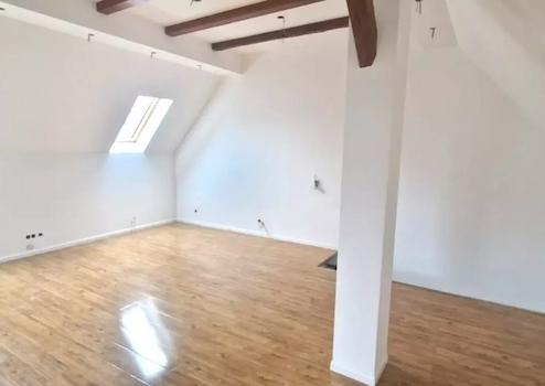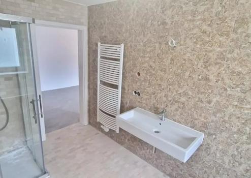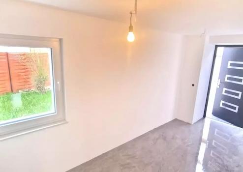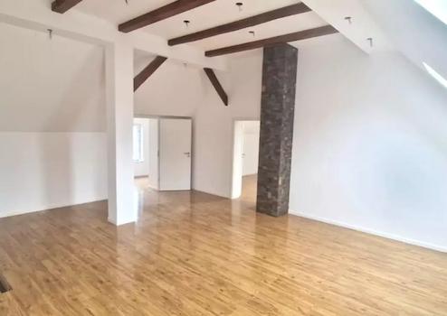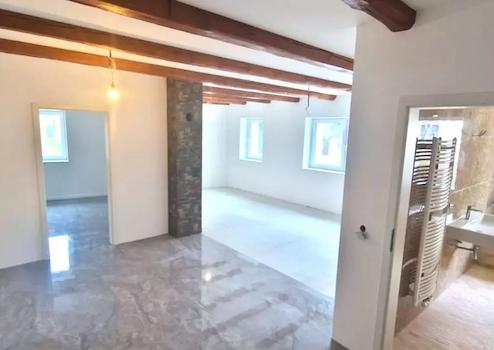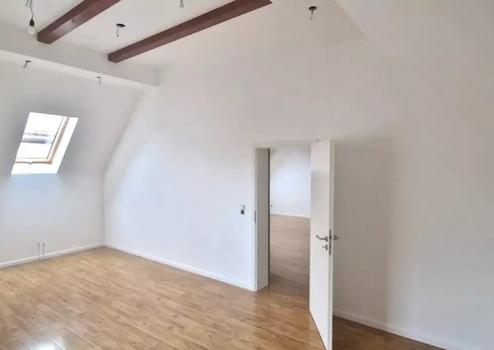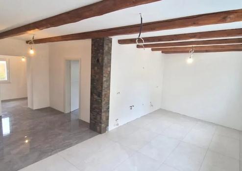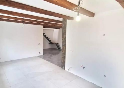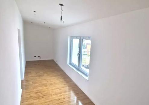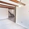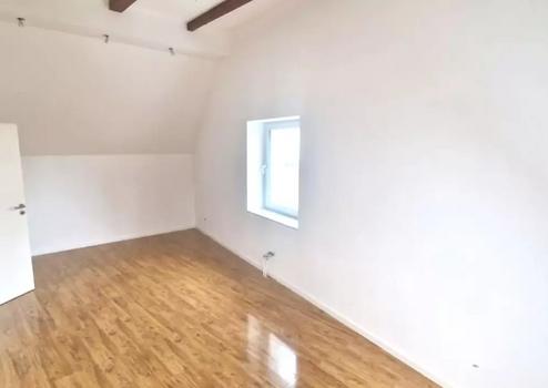Durch den großzügigen Flur gelangen Sie ins Wohnzimmer mit offener Küche. Die Balken, die auf dem Bild zu sehen sind, bleiben im Zimmer als Dekoelement behalten. Dank der großen Fenster sind die Zimmer hell und gemütlich. Im Erdgeschoss befindet sich auch das Kinderzimmer/Gästezimmer sowie ein geräumiges Tageslichtbad. Im Obergeschoss befindet sich das großzügige Wohnzimmer mit attraktiven Deckenhöhen. Vom Wohnzimmer haben Sie zum Schlafzimmer und einem weiteren Kinderzimmer Zugang. Auch hier verschönern die neuen Dachbalken aus der Hauskonstruktion den Wohnraum und sorgen für eine gemütliche Atmosphäre.