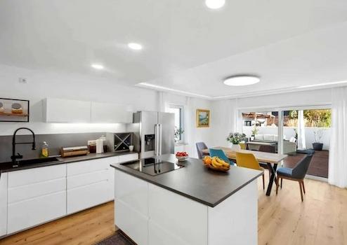 •Einbauküche (Kochinsel, Bosch-Geräte, Side-by-Side-Kühlschrank) und Badmöbel können für 15.000 € erworben werden